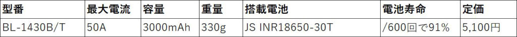 40V / 3000mAh / 最大瞬間放電電流60A / 最大継続放電電流40A